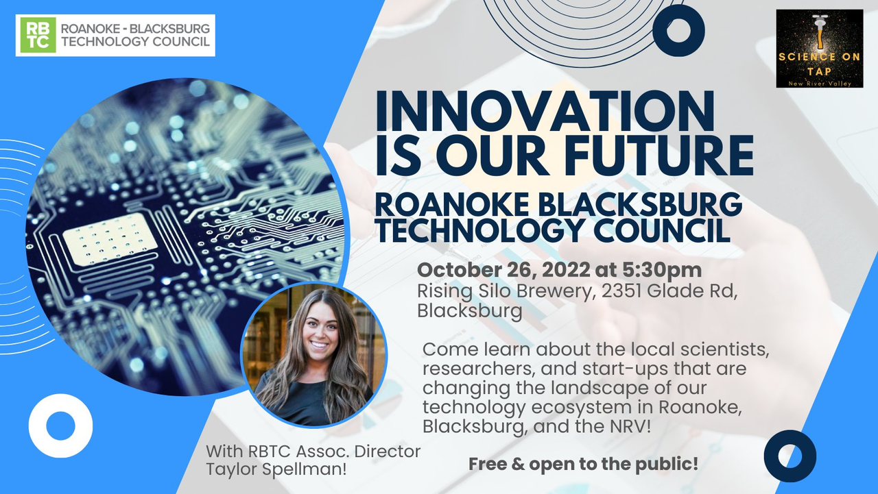 Science on Tap - New River Valley presents the program "Innovation is Our Future" on Wednesday, October 26, 2022 at Rising Silo Farm Brewery in Blacksburg, VA.