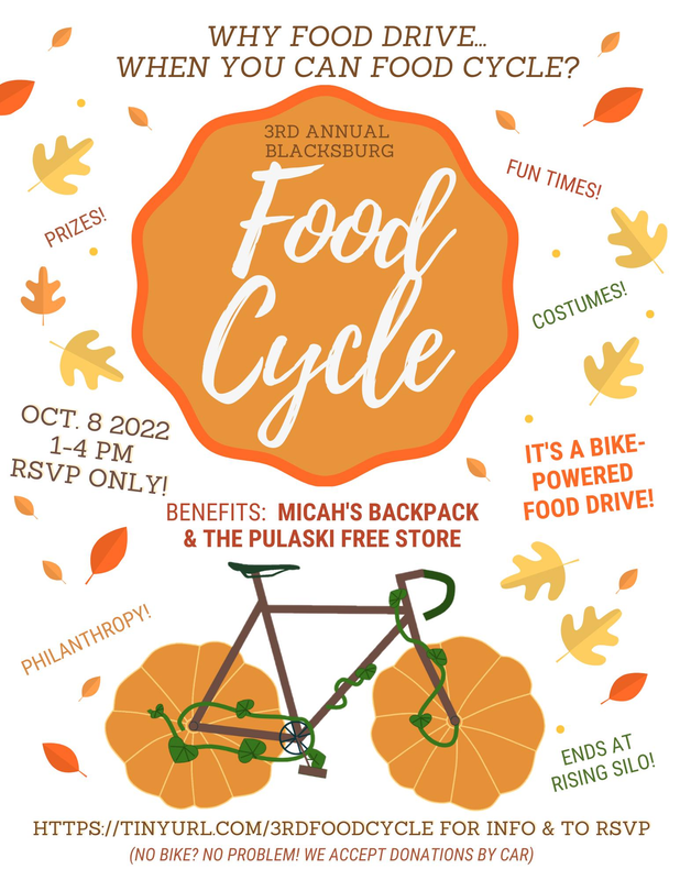 The Blacksburg Food Cycle is a bike-powered food drive where participants bike around town to buy groceries for those in need with 100% of the donations benefitting Micah's Backpack and the Pulaski County Free Store.