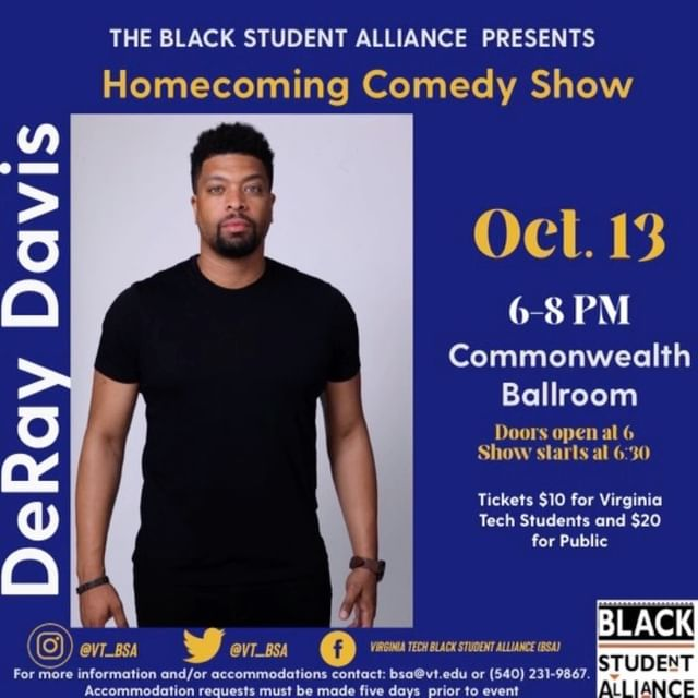 The Black Student Alliance at Virginia Tech presents the Homecoming Comedy Show with DeRay Davis on Thursday, October 13, 2022 inside the Commonwealth Ballroom located within the Squires Student Center on the campus of Virginia Tech.
