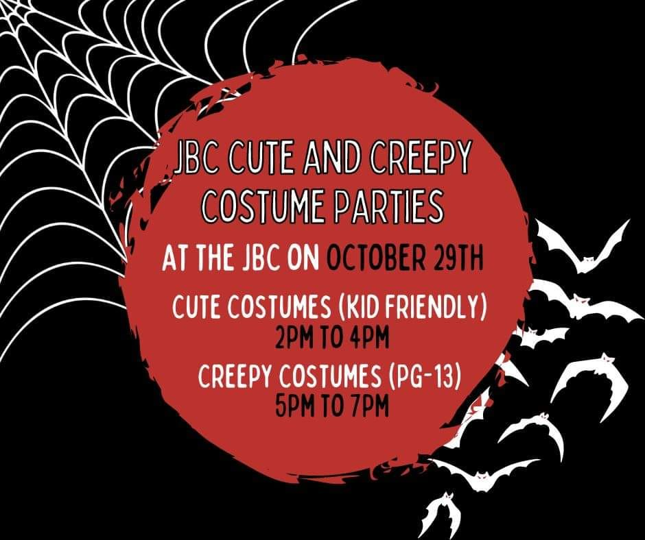 Join us for our cute and creepy costume party! There will be snacks, music, and lots of jitterbuggin'! These parties are separated based on age and/or tolerance of scary costumes.