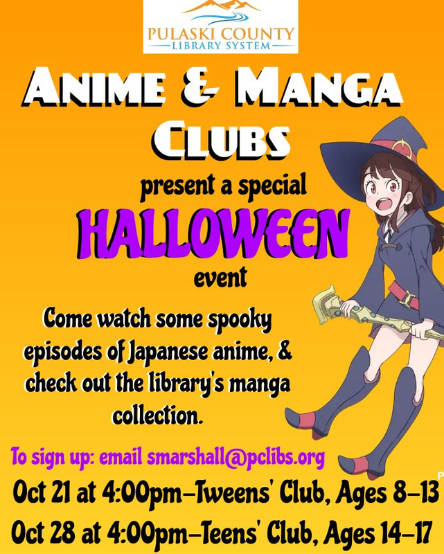 The Pulaski County Library presents the Halloween Edition of Teens Anime & Manga Clubs on Friday, October 28, 2022.