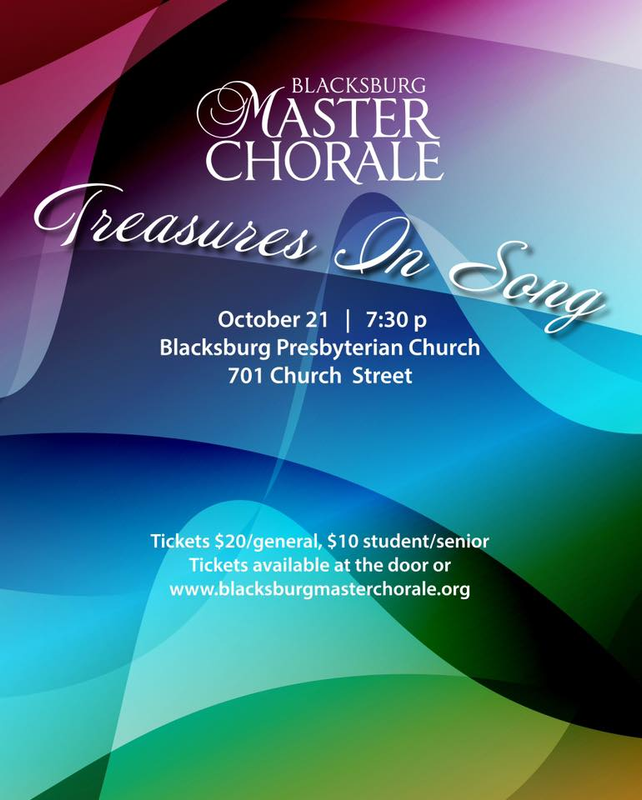 The Blacksburg Master Chorale presents their 2022 Fall Concert titled "Treasures In Song: The Best of the BMC" on Friday, October 21, 2022 at 7:30 PM at Blacksburg Presbyterian Church.