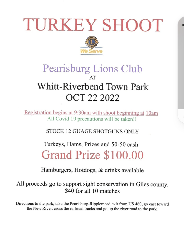 The Pearisburg Lions Club presents the 2022 Turkey Shoot on Saturday, October 22, 2022 at the Whitt-Riverbend Park.