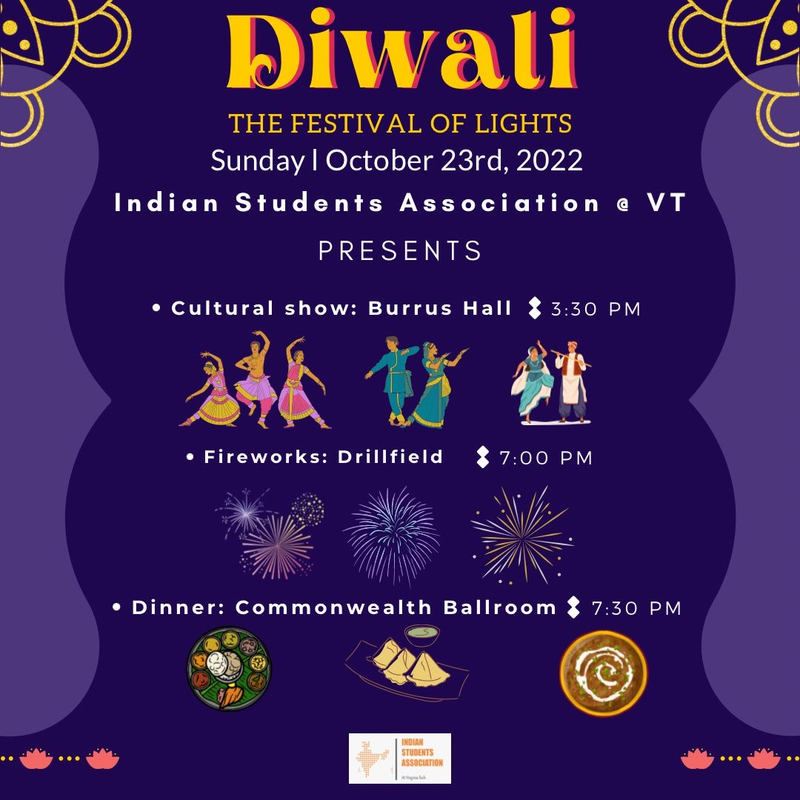 The Indian Students Association (ISA) at Virginia Tech presents the Diwali Extravaganza 2022: Cultural Show and Fireworks Celebration on Sunday, October 23, 2022 at Burruss Auditorium on the campus of Virginia Tech.