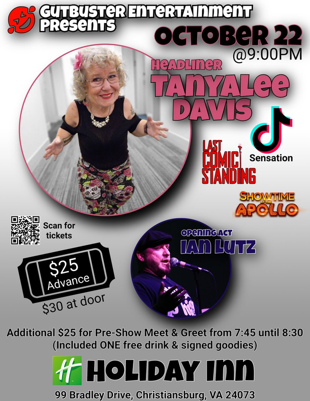 Gutbuster Entertainment presents Comedian Tanyalee Davis performing with opening act Ian Lutz on Saturday, October 22, 2022 at the Holiday Inn Christiansburg.