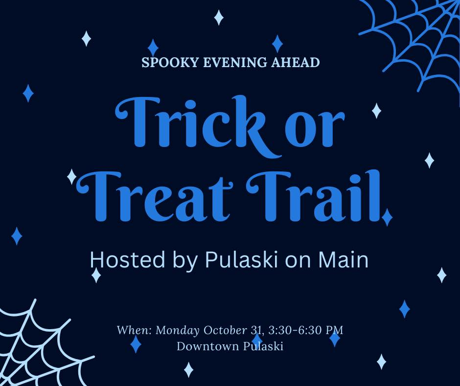 Pulaski on Main presents the 2022 Pulaski Trick or Treat Trail on Monday, October 31, 2022 at participating downtown Pulaski, VA businesses.