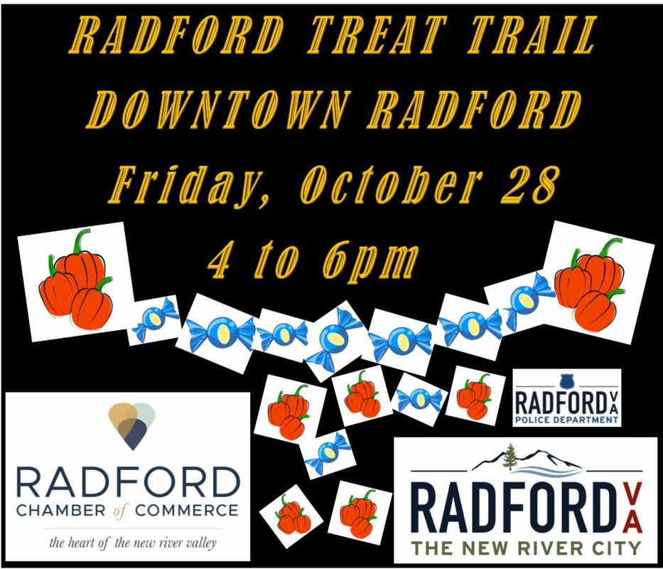 The Radford City Chamber of Commerce and City of Radford presents the 2022 Radford Treat Trail on Friday, October 28, 2022 at participating businesses in downtown Radford, VA primarily along East Main Street.