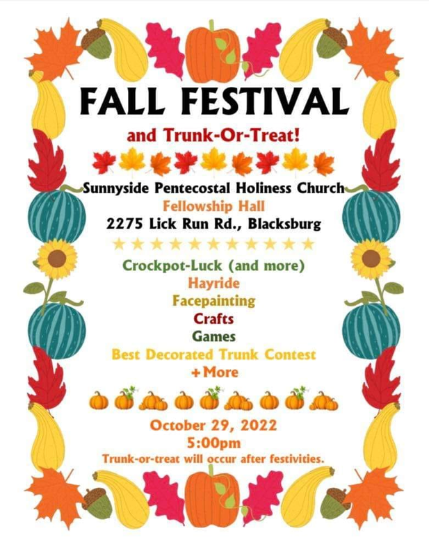 Sunnyside Pentecostal Holiness Church presents their 2022 Fall Festival & Trunk or Treat on Saturday, October 29, 2022.