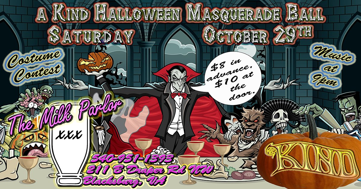 The Kind presents their Annual Halloween Masquerade Ball with Costume Contest on Saturday, October 29, 2022 at The Milk Parlor in downtown Blacksburg, VA.