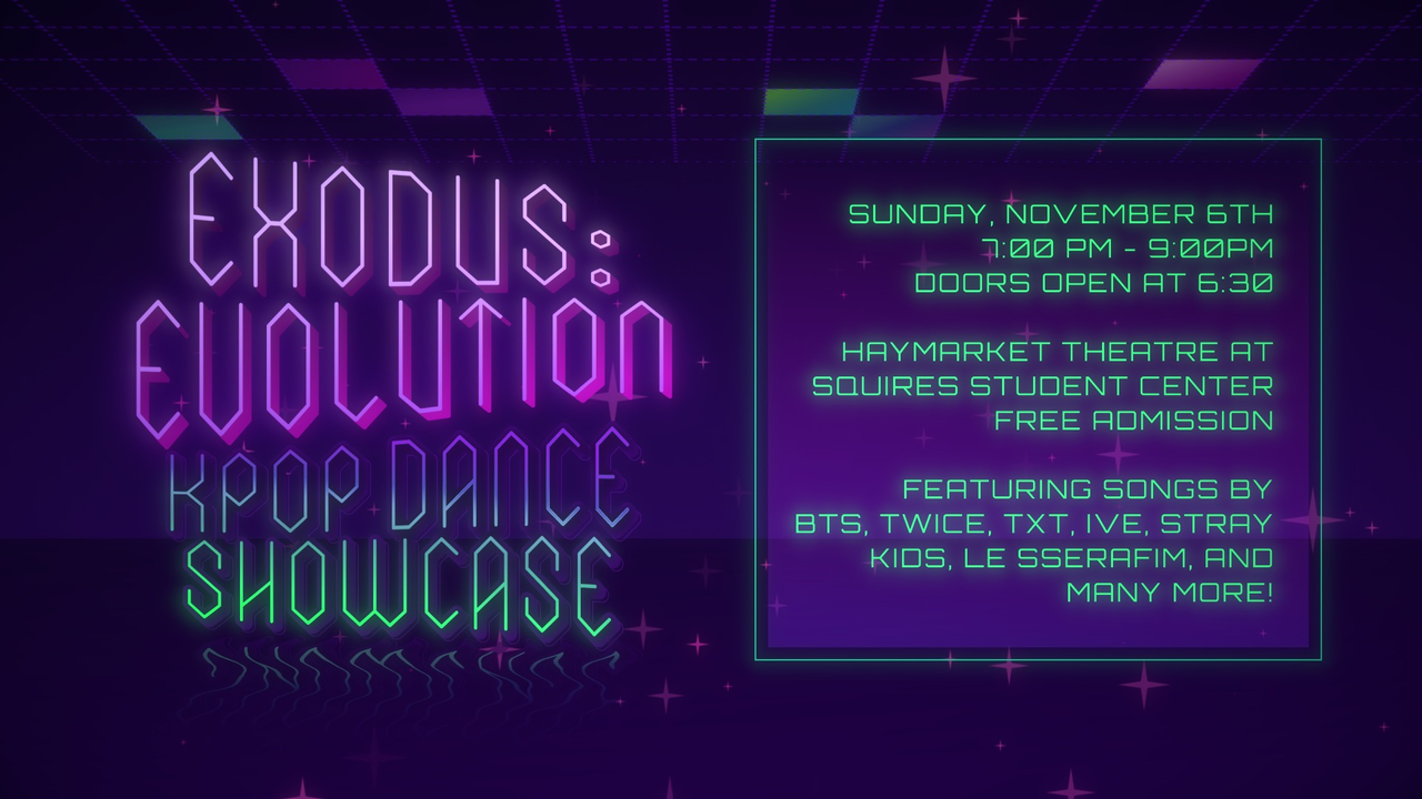 Exodus at Virginia Tech presents their Fall 2022 K-pop Showcase titled "Evolution" on Sunday, November 6, 2022 at Haymarket Theater located within the Squires Student Center on the campus of Virginia Tech.