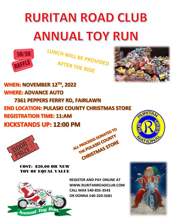 The Ruritan Road Ruritan Club presents the 2022 Annual Toy Run for Pulaski County Christmas Store on Saturday, November 12, 2022 starting at Advance Auto Parts in Fairlawn, VA.