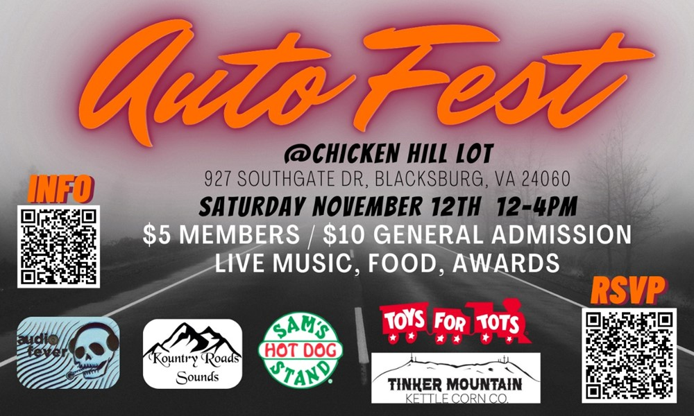 Truck Club at Virginia Tech welcomes you to our very first Auto Fest! Enjoy the largest automotive event on Virginia Tech's campus. This family-friendly event will showcase cars, trucks, motorcycles, student organizations and a whole lot more! Awards, giveaways, music from Kountry Roads Sounds and Audio Fever, and food from Sam's Hot Dogs and Tinker Mountain Kettle Corn will also be at the event.