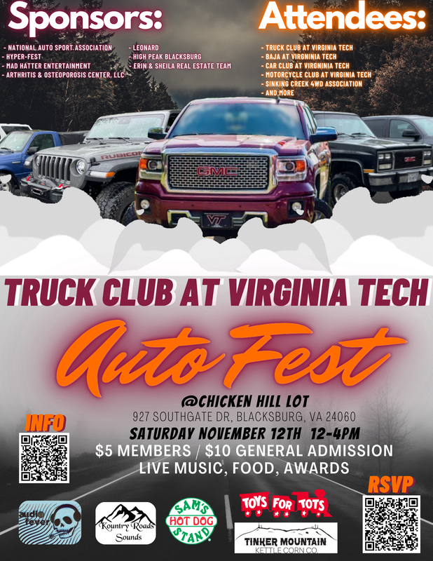 The Truck Club at Virginia Tech presents their Auto Fest on Saturday, November 12, 2022 in the Chicken Hill Parking Lot on the campus of Virginia Tech.