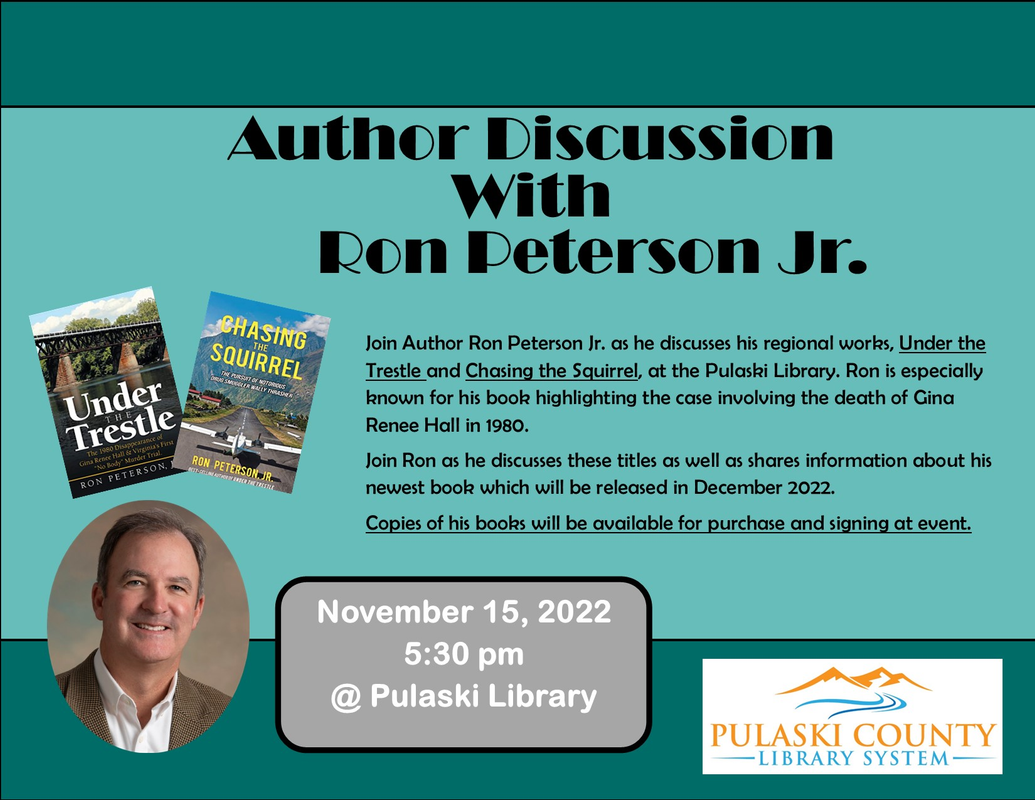 Pulaski County Library presents an Author Discussion with Ron Peterson, Jr. on Tuesday, November 15, 2022.