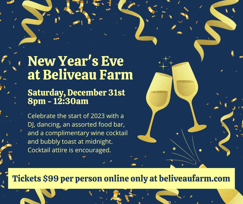 Beliveau Farm Winery presents their New Year's Eve Party on Saturday, December 31, 2022 with the deadline to purchase tickets by Tuesday, December 27, 2022.