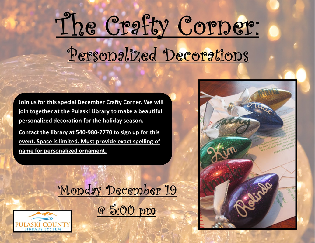 Join us for this special December Crafty Corner. We will join together at the Pulaski Library to make a beautiful personalized decoration for the holiday season.
