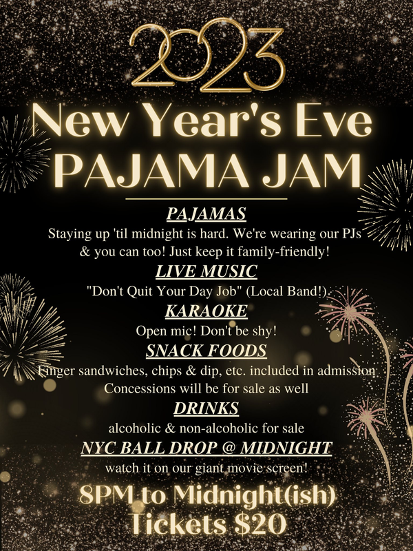 Enjoy local music from Don't Quit Your Day Job and an open mic karaoke. Snack foods are included with ticket purchase and will include finger sandwiches, chips, salsa & more. At midnight, enjoy the New York City Ball Drop on the giant movie screen.