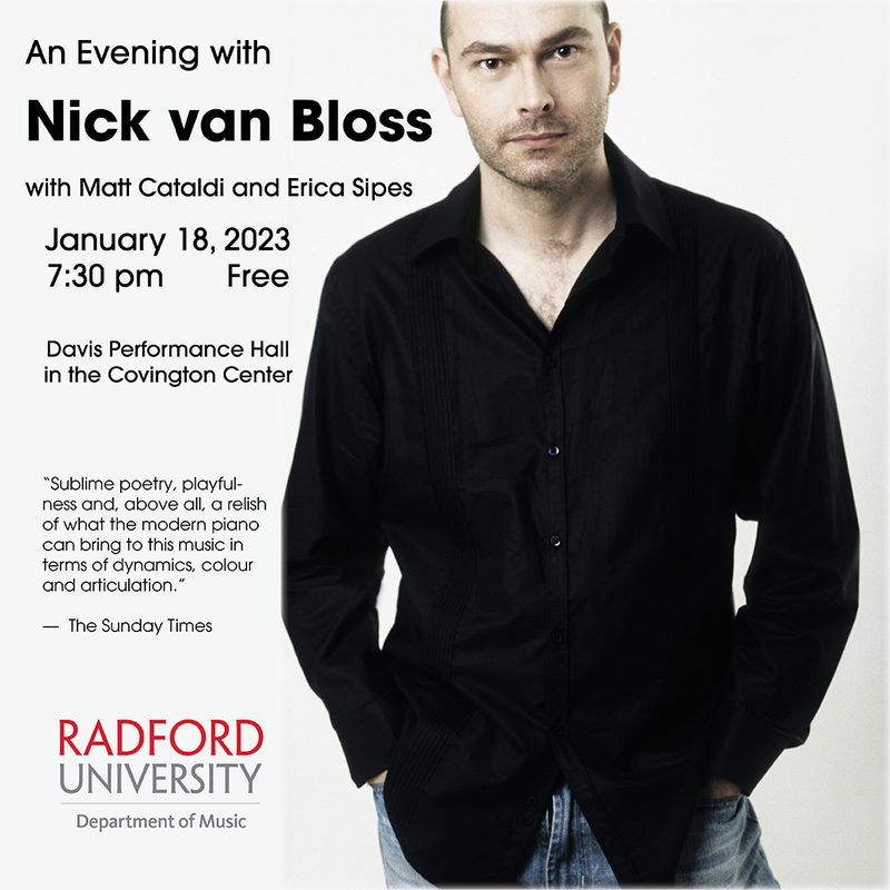 Internationally celebrated classical pianist, Nick van Bloss, will perform in the Davis Performance Hall in the Covington Center on Radford University's main campus on Wednesday, January 18, 2023 at 7:30 pm.