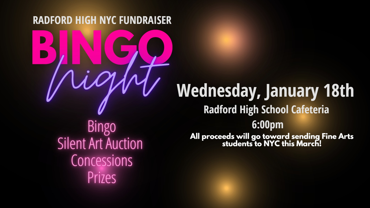 Radford High School Visual and Performing Arts will be hosting our first ever Bingo Night Fundraiser. We will have concessions, a silent art auction and prizes to win for each Bingo game.