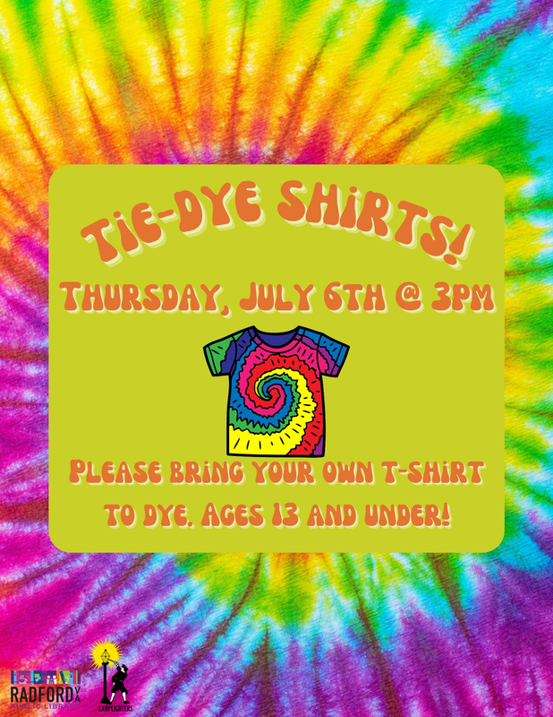 The Radford Public Library presents the program "Create Kids Tie-Dye Shirts" on Thursday, July 6, 2023.