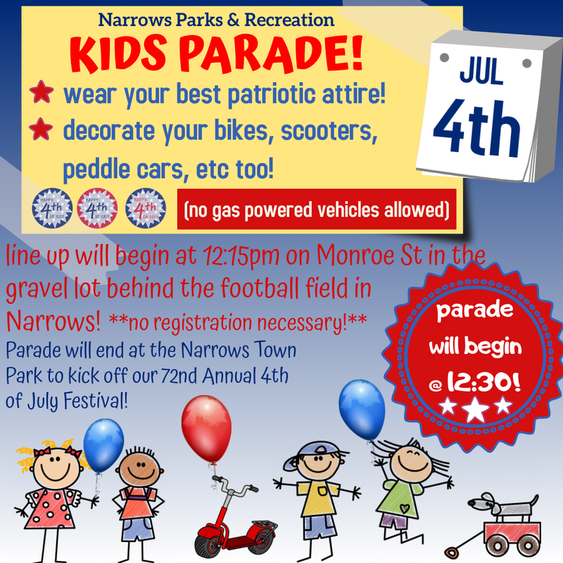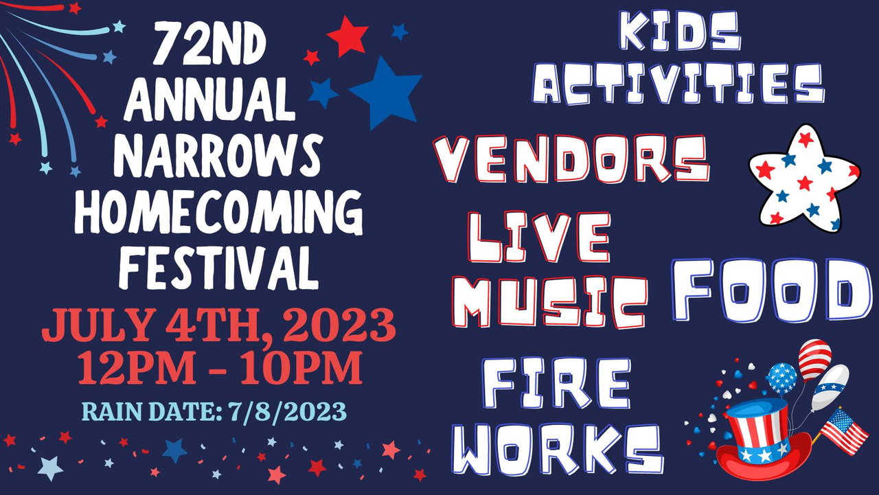 The Town of Narrows and the Narrows Parks & Recreation presents the 72nd Annual Narrows Homecoming Festival and July 4th Celebration on Tuesday, July 4, 2023 at the Narrows Town Park.