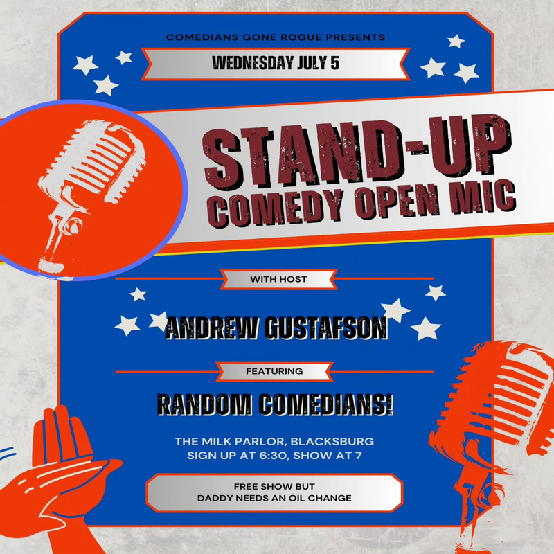 All comedians and aspiring comedians are invited to get on stage and share their jokes with host Andrew Gustafson. Audience members are invited to watch your future favorite comedians try out new material and get on stage for the first time.