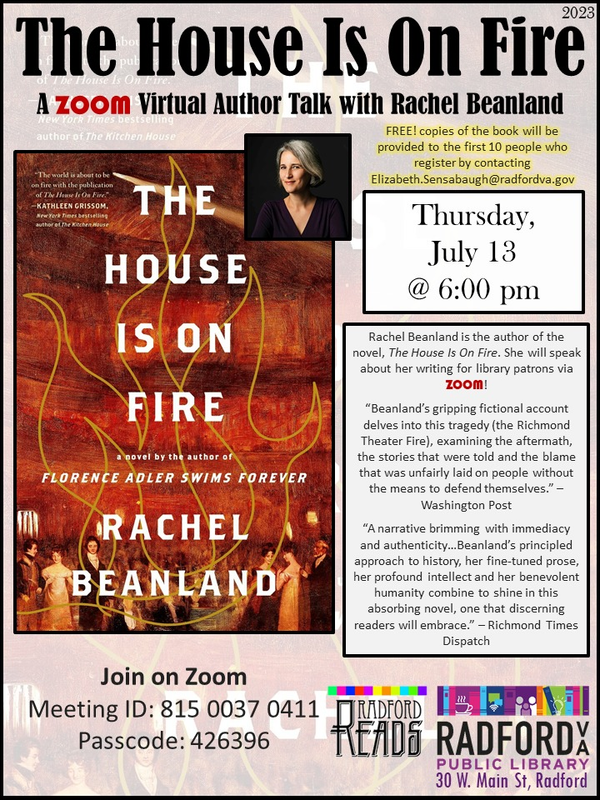 The Radford Public Library presents A Zoom Virtual Author Talk with Rachel Beanland, author of "The House Is On Fire" on Thursday, July 13, 2023.