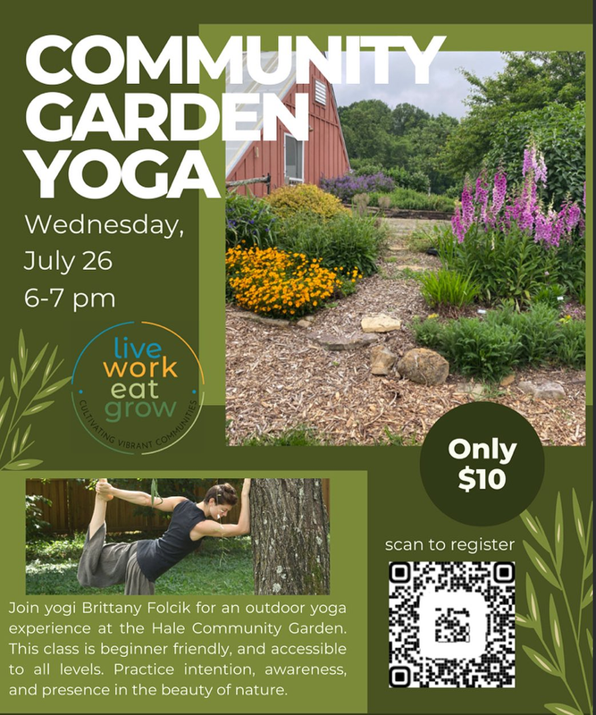 Live Work Eat Grow presents Community Garden Yoga on Wednesday, July 26, 2023 at The Hale Community Garden in Blacksburg, VA.