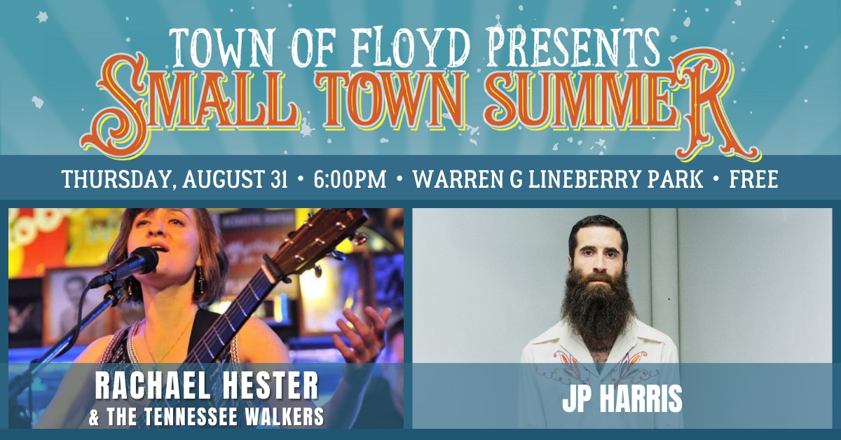 The Town of Floyd wraps up its 6th Annual Floyd Small Town Summer series with JP Harris and Rachael Hester & The Tennessee Walkers on Thursday, August 31, 2023 outside at Warren G. Lineberry Memorial Park.