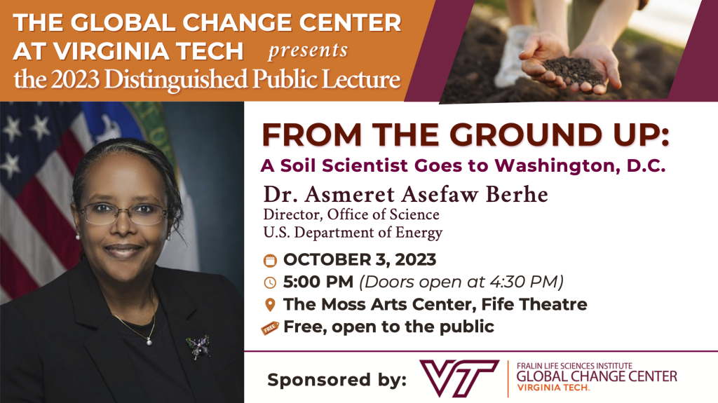 The Global Change Center at Virginia Tech's Distinguished Public Lecture will return this fall on Tuesday, October 3, 2023 featuring Dr. Asmeret Asefaw Berhe at the Moss Arts Center.