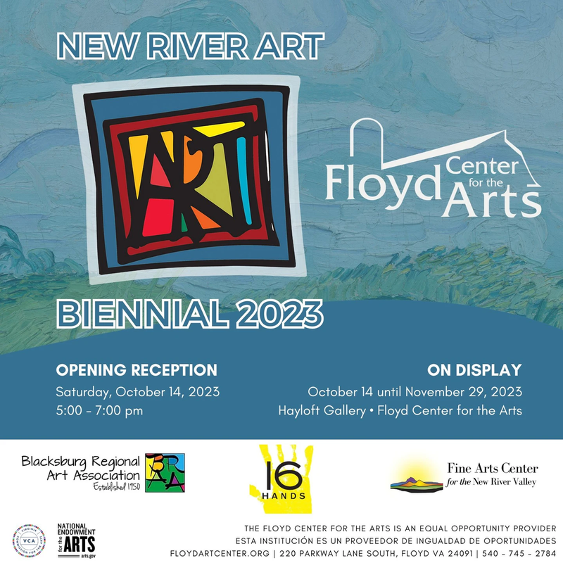 The Floyd Center for the Arts presents the Opening Reception for the 17th New River Art Biennial Exhibit which will be installed in the Center's Hayloft Gallery starting on Saturday, October 14, 2023.