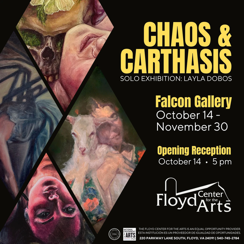 Simultaneously, our Falcon Gallery will host a captivating solo exhibit by emerging artist Layla Dobos, titled "Chaos and Catharsis" which will be on display from October 14th - November 30th.