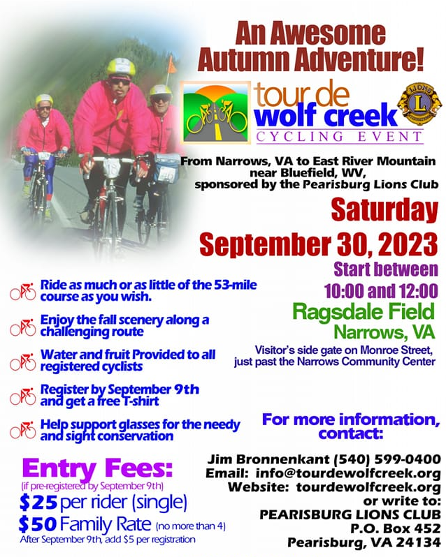 The Pearisburg Lions Club presents Tour de Wolf Creek Cycling Event on Saturday, September 30, 2023 starting and ending at Ragsdale Field in Narrows, VA starting anytime between 10:00 AM and 12:00 PM.