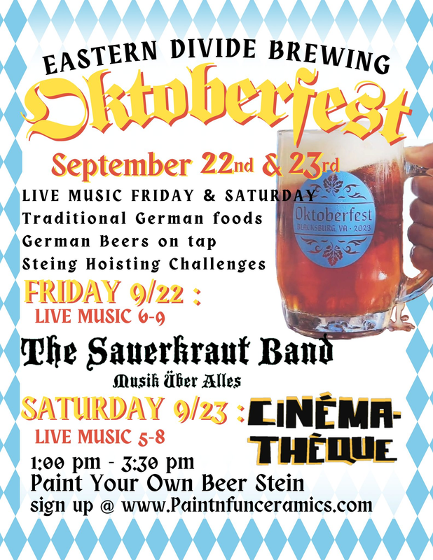 Its that time again to prost and celebrate Eastern Divide Brewing Company's Oktoberfest 2023! Enjoy traditional German foods and German beers on tap along with live music from The Sauerkraut Band from 6:00-9:00 PM and Stein Hoisting Challenges and Stein games starting at 4:00 PM.