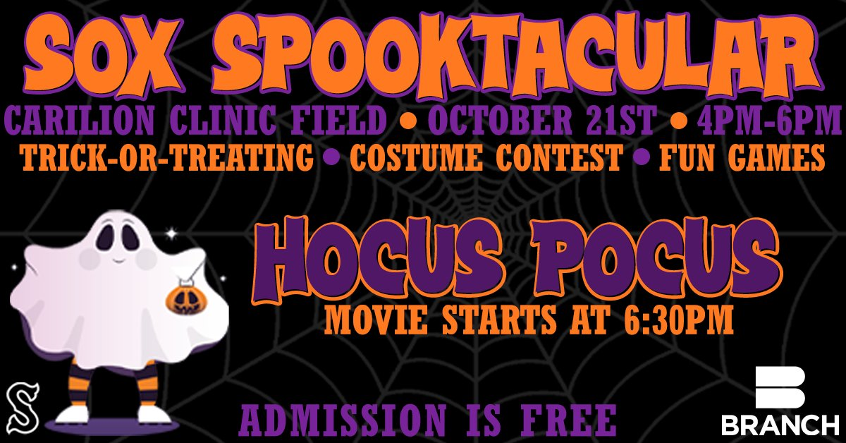 The Salem Red Sox presents Sox Spooktacular and Hocus Pocus Movie Night on Saturday, October 21, 2023 at Carilion Clinic Field.