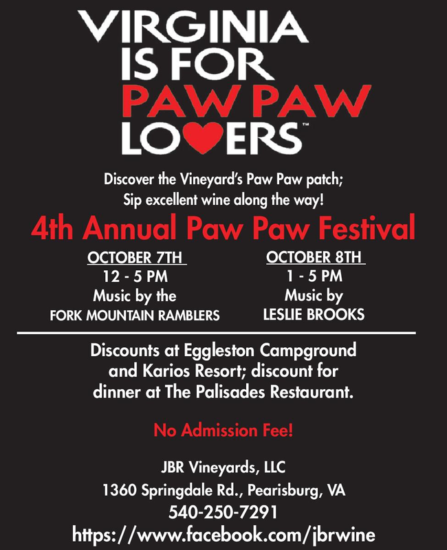 JBR Vineyards presents their Fourth Annual Pawpaw Festival on Saturday, October 7, 2023 from 12:00-5:00 PM and on Sunday, October 8, 2023 from 1:00-5:00 PM.