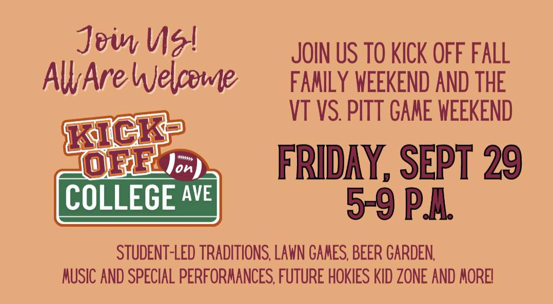Virginia Tech, Downtown Blacksburg, Inc. and the Town of Blacksburg presents the Kick-Off on College Avenue on Friday, September 29, 2023.