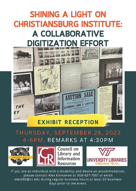 Join us in a reception for the Fall 2023 Exhibit "Shining a Light on the Christiansburg Institute: A Collaborative Digitization Effort". This exhibit celebrates the history of the Christiansburg Institute and their recent partnership with Virginia Tech University Libraries to digitize their museum and archive. Christiansburg Institute alumni, descendants, and supporters will be attending to view the exhibit. This is a great opportunity to connect with engaged community members to discuss our region’s Black cultural heritage.
