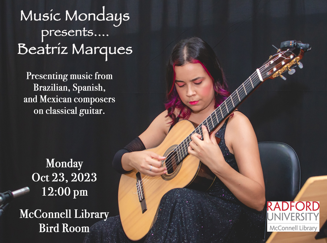 The McConnell Library, on the campus of Radford University, continues their Music Mondays series with Beatriz Marques on Monday, October 23, 2023 inside the Bird Room.