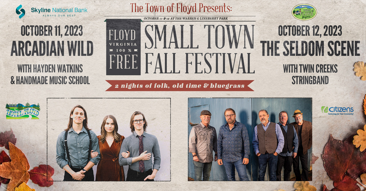 The Town of Floyd continues the 2023 Floyd Small Town Fall Festival with The Seldom Scene and opener Twin Creeks Stringband on Thursday, October 12, 2023 outside at Warren G. Lineberry Memorial Park.