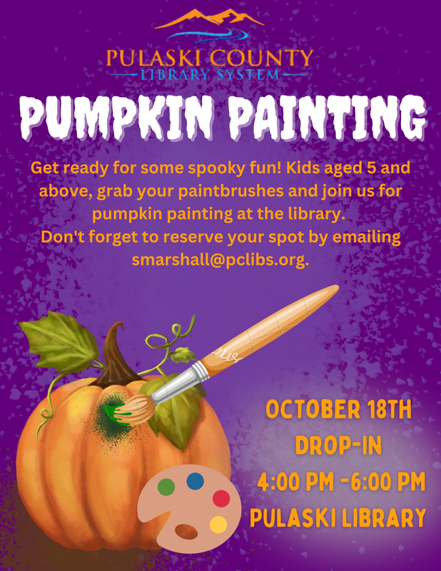The Pulaski County Library presents Pumpkin Painting for Ages 5 & Up on Wednesday, October 18, 2023.