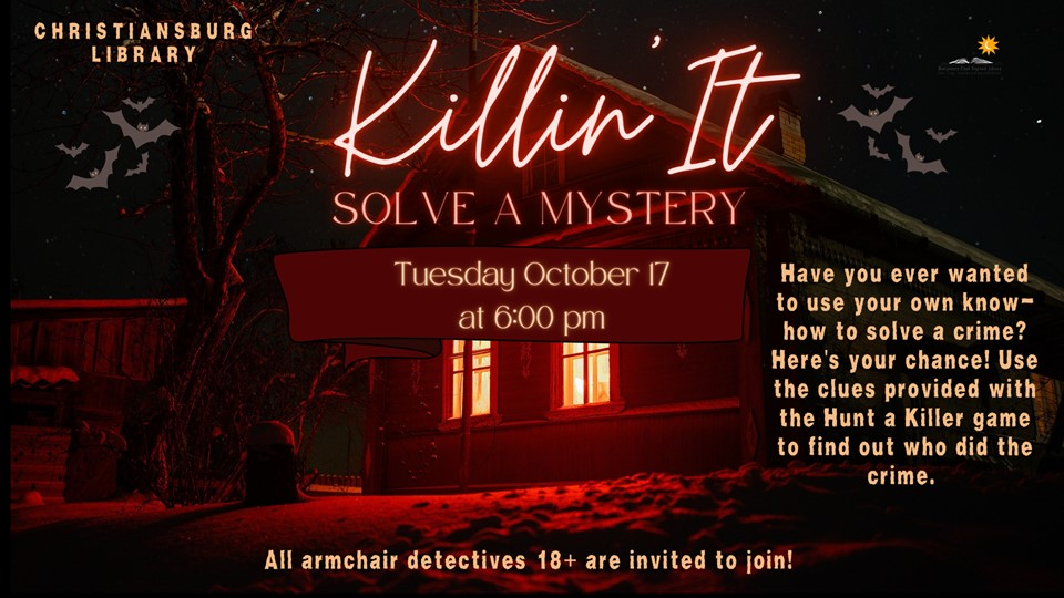 The Christiansburg Library presents Killin' It: Solve a Mystery on Tuesday, October 17, 2023.