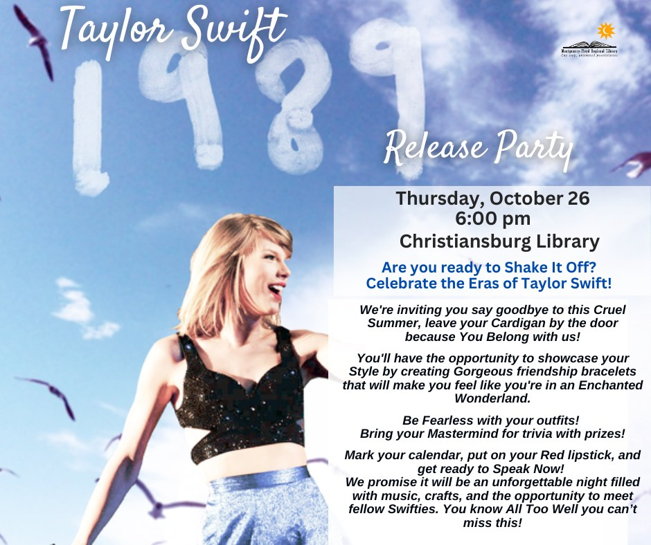 The Christiansburg Library presents a Taylor Swift "1989" Release Party on Thursday, October 26, 2023.