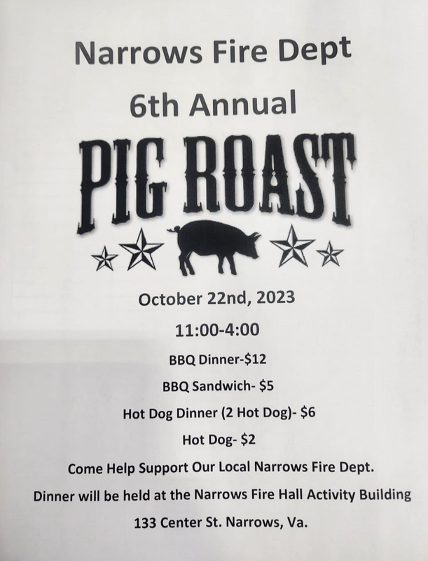 The Narrows Fire Department presents their 6th Annual Hog Roast and Vendor Show on Sunday, October 22, 2023 at the Narrows Volunteer Fire Department Activity Building.