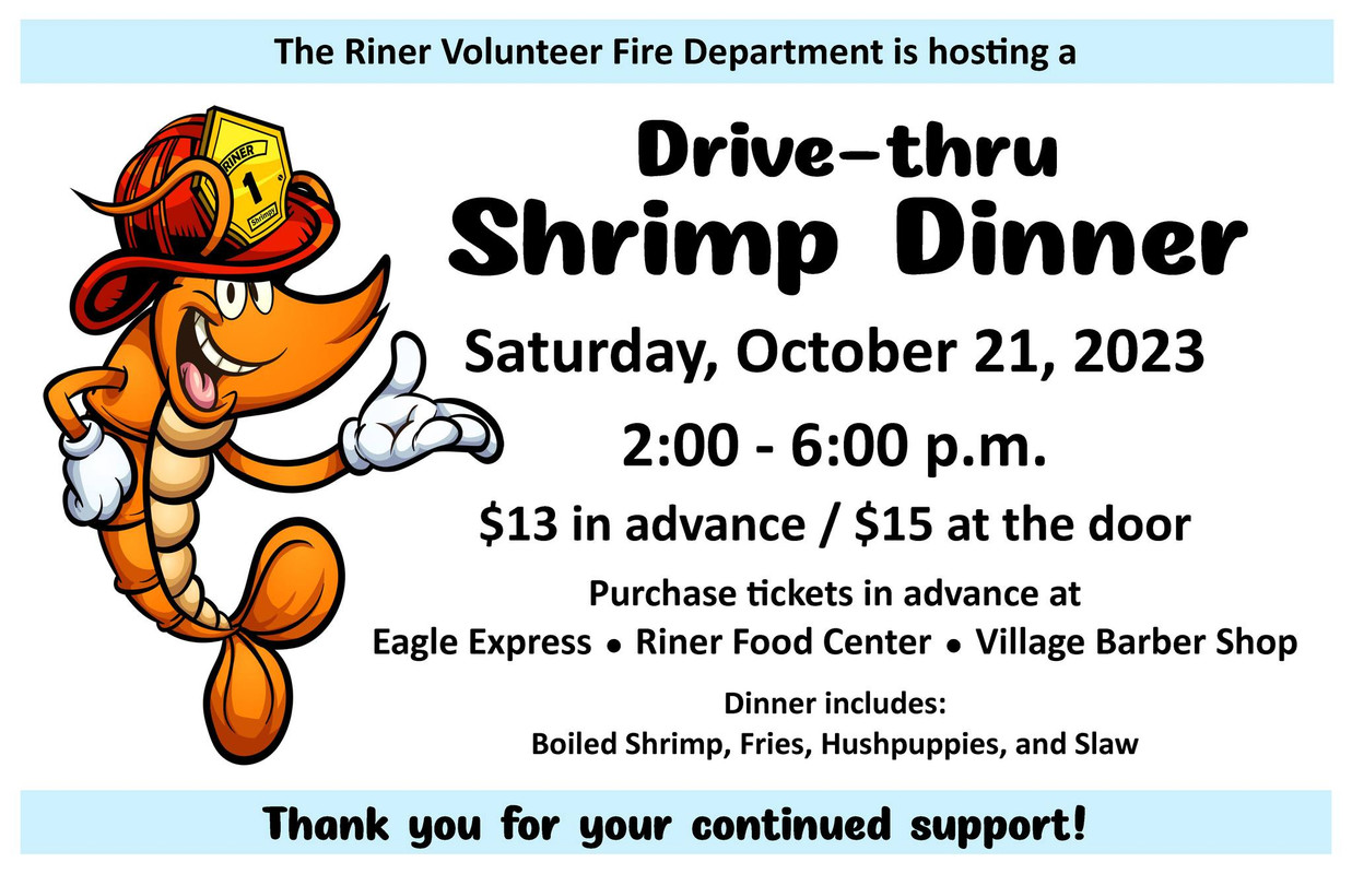 Riner Volunteer Fire Department presents a Drive-Thru Shrimp Dinner on Saturday, October 21, 2023.