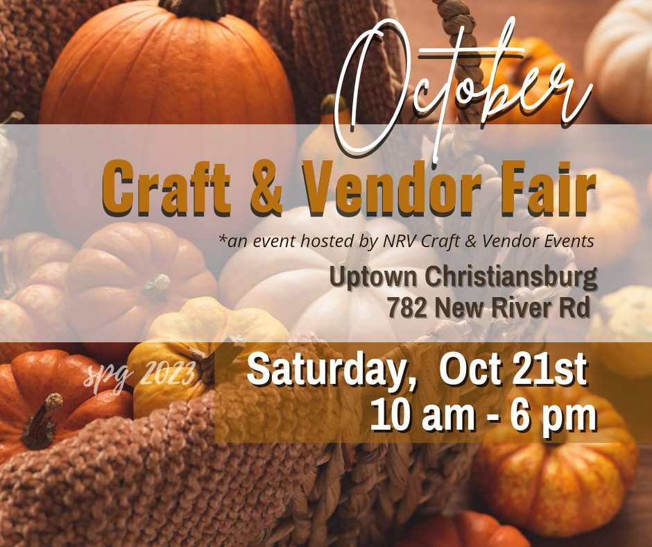 NRV Craft & Vendor Events hosts their 2023 October Craft & Vendor Fair on Saturday, October 21, 2023 at Uptown Christiansburg (formerly New River Valley Mall).