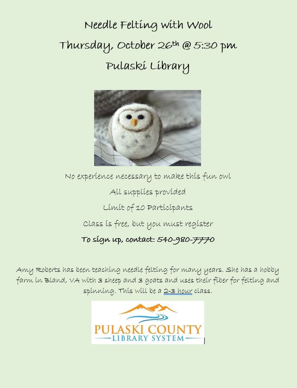 The Pulaski County Library presents the free class "Needle Felting with Wool" on Thursday, October 26, 2023.