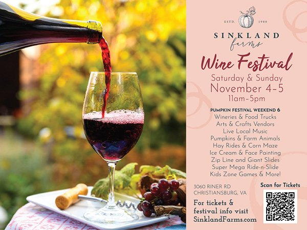 Join Sinkland Farms for our first annual Wine Festival on a beautiful fall weekend. Wine Enthusiast Magazine named Virginia "One of the 10 Best Wine Travel Destinations" in the world and the Sinkland Farms Wine Festival will showcase a variety of Virginia wines.