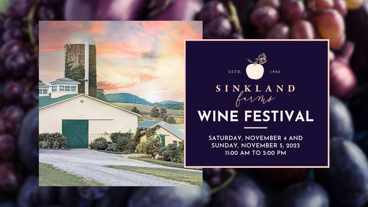 Sinkland Farms presents their Inaugural Wine Festival on Saturday, November 4, 2023 and Sunday, November 5, 2023 from 11:00 AM to 5:00 PM daily.