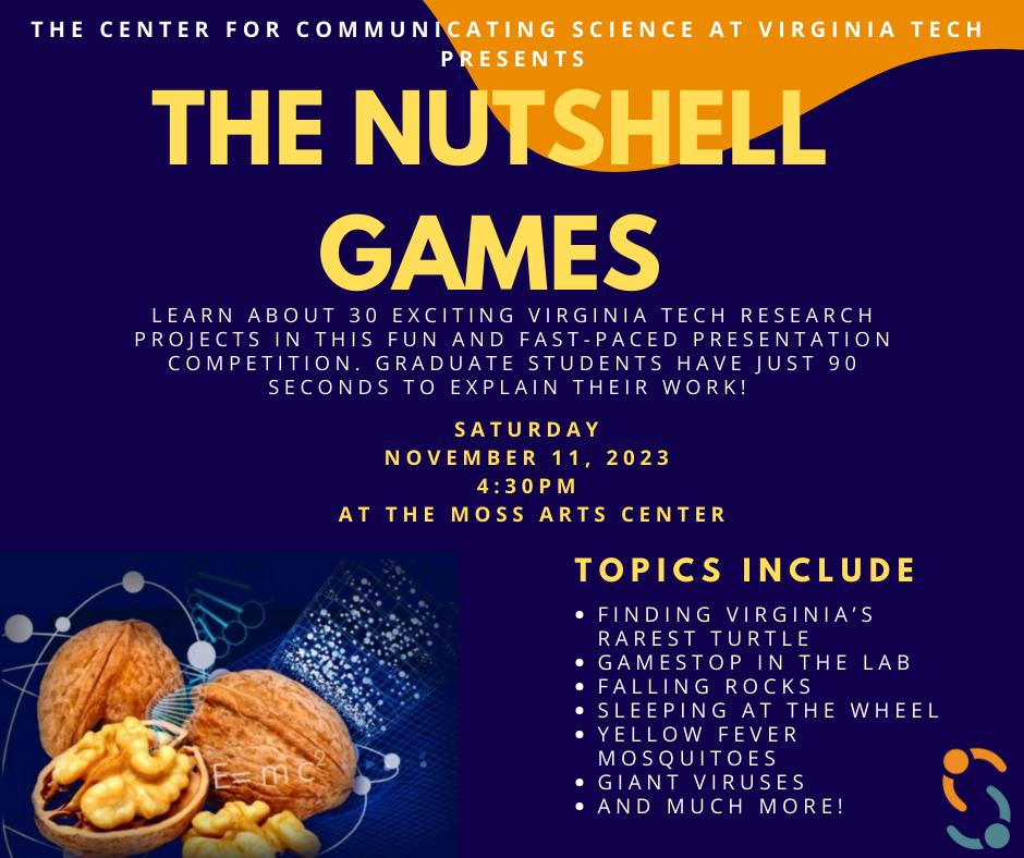 The Virginia Tech Center for Communicating Science presents The Nutshell Games on Saturday, November 11, 2023 inside the Moss Arts Center at Virginia Tech.